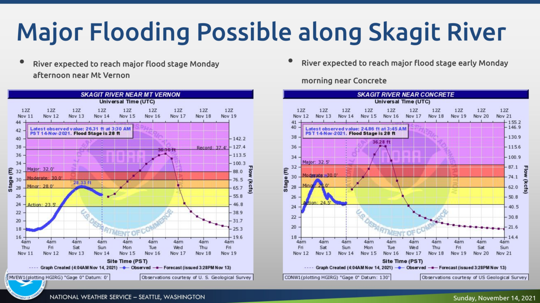 The extended flood watch will stay in place until late Tuesday afternoon, with rivers across the region likely to be running high. The latest river forecasts show flood stages lower than the last storm in the Central and South Sound, potentially reaching the moderate stage along the Snoqualmie and Snohomish rivers. Forecasters are keeping a close eye on northern rivers, some of which could see some major flooding.