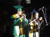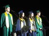 As "Pomp and Circumstance" was played by the band, the senior boys came in dressed in green gowns and gold stoles while the girls entered wearing blue gowns and gold stoles.