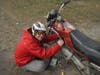 When we stopped for a break from the traffic, Andy's bike started leaking gas out of the carburetor. He fixed it with the shoelace from his vans skate shoes.