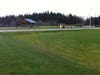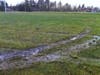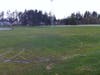 Today, the damage was visible, as the jumbled circles of tire tracks remained on the field. The driver apparently entered the park driveway and made a sharp right down onto the playfields, where he did donuts and that flung chunks of grass up and onto the nearby parking lot.