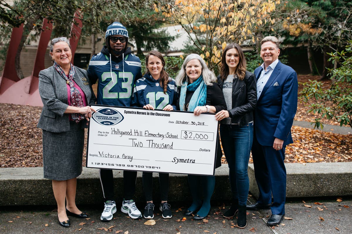 Symetra and the Seattle Seahawks honored Hollywood Hill Elementary School teacher Victoria Gray as a “Symetra Hero in the Classroom” on Oct. 30. Seattle Seahawks Cornerback Neiko Thorpe (#23) was on hand to help present the award during a surprise assembly at the Woodinville school, where Gray is a physical education instructor. Symetra Executive Vice President Michael Fry joined Thorpe for the presentation, which was attended by Northshore School District Superintendent Michelle Reid.