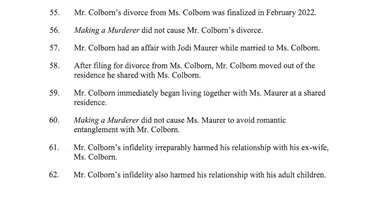 "Making a Murderer did not cause Ms. Maurer to avoid romantic involvement with me," Colburn declared in a sworn statement from July 21. "My relationship with Ms. Maurer harmed my relationship with my ex-wife, Ms. Colborn.