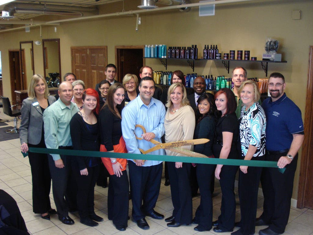 Pictured from left to right in front row: Jackie Ruppel of M&I, a part of BMO Financial Group, Dan Schultz of the Greater Brookfield Chamber of Commerce, Alex Scherf, Amanda Brulz, Charlie Bianco, Monica Bianco, Tia Matson, and Ambre Kowak all of Charlie's East Coast Hair Designs, Carol White of the Greater Brookfield Chamber of Commerce, and Tony Iannice of Carrabba's Italian Grill