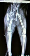 1. An xray of a cat pulled by a local rescue was held at MADACC for at least seven days with this fracture without treatment. Apparently they knew of the injury but did not treat it and when she was finally released to a rescue, she was sent with antibiotics but no pain medication. The rescue immediately took the cat to their veterinarian who took this xray and recommended that the cat have emergency surgery to repair the broken femur.