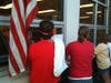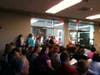 Some protesters stood outside, watching and listening to the meeting through open windows. Others listened and watched in the lobby, peaking in through open doors.