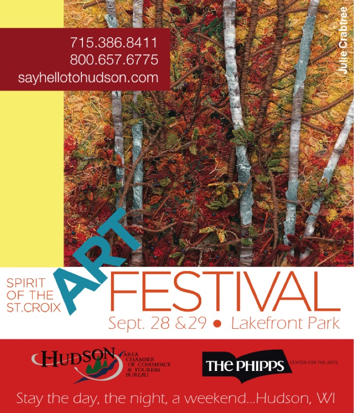 Whether you wish to throw pottery on a wheel, enjoy the skills of an Amish woodworker, or find that one-of-a-kind original artwork, the Hudson Area Chamber of Commerce & Tourism Bureau in partnership with The Phipps Center for the Arts invites you to be inspired! Join us for Spirit of the St. Croix Art Festival, September 28 & 29 in Lakefront Park on the beautiful St. Croix River, Hudson, WI.