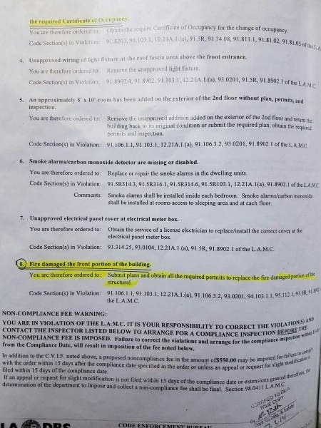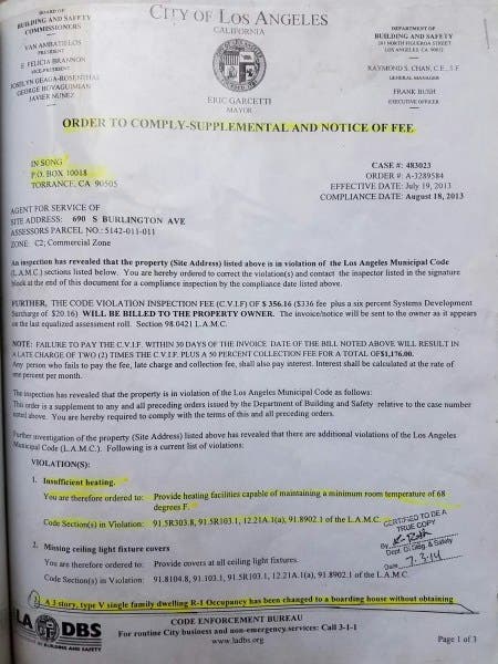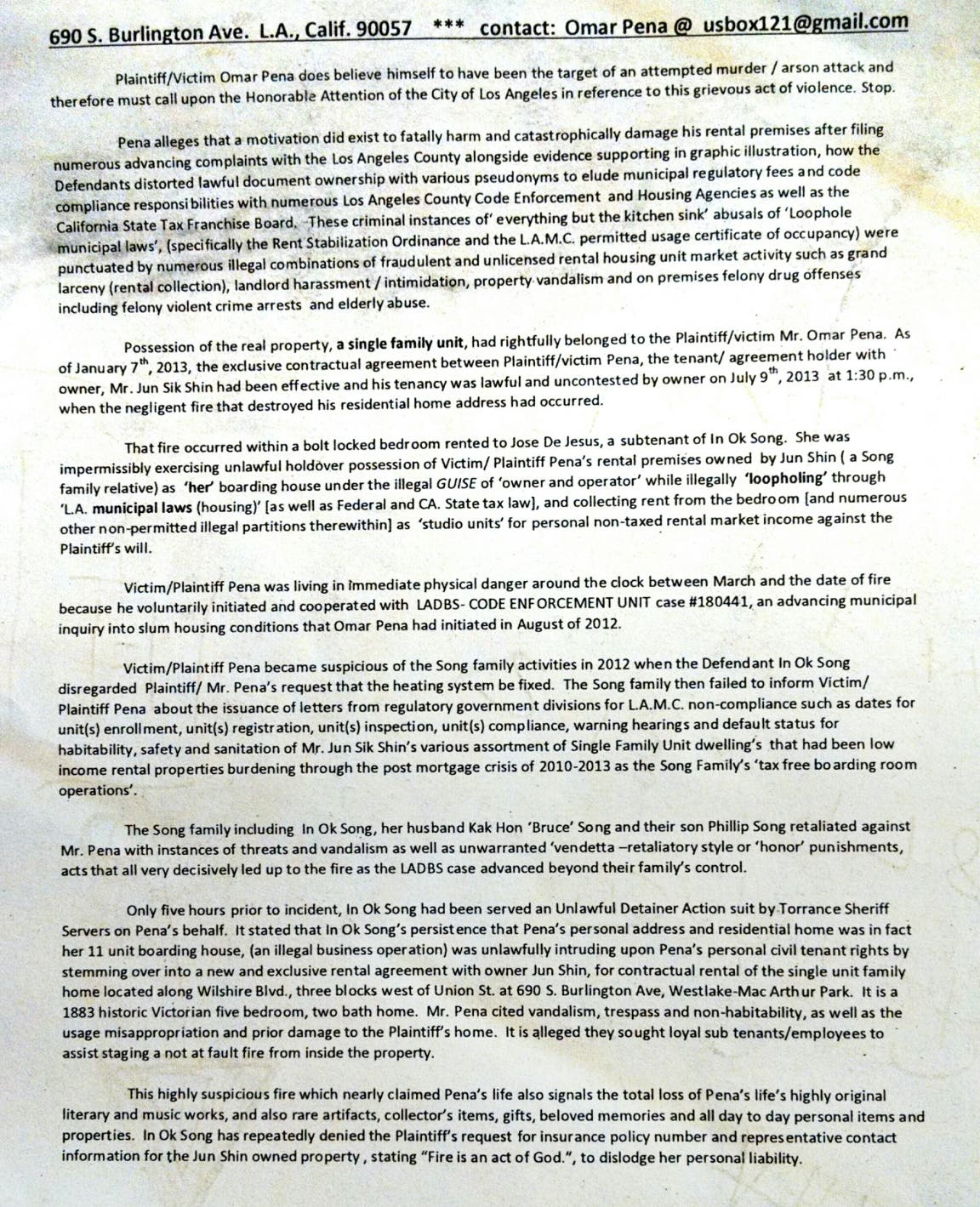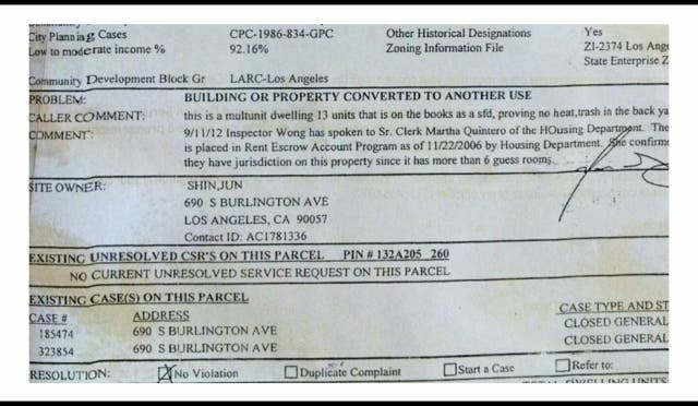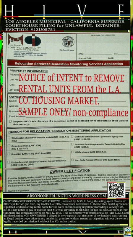 Furthermore, in the spring of 2015, In Ok Song misleadingly filed as owner, for demolition permits against my residential property with LADBS Mechanical and Engineering Permit Enforcement, cited in LADBS case #483023, [Michael Walker, LADBS legal code enforcement unit liason], despite no cancellation of my rental agreement expressly from Jun Shin, without notification of intent to demolish to the lawful tenant and without lawful ownership, based on a potentially ill devised financial transaction as is expressly evident, in my mind, by a repetitive pattern of documented lies and municipal employee oversights that add up to some pricey conciliations, including the LAFD budget costs for the firefighting expenses associated with Commander Emile Mack and his 127 0' man CLEAN UP CREW, on county time and at Los Angeles' Constituencies' taxpaying expense.