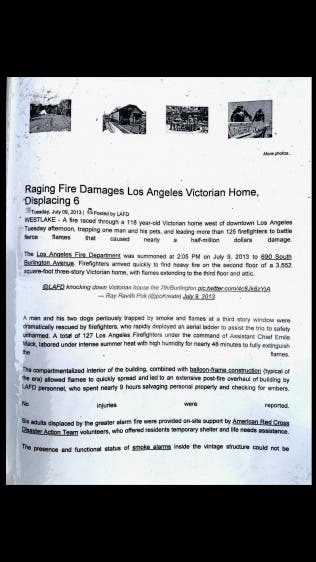 The Song family and a network of operatives conspiring to illegally forcibly evict me by ARSON, now, within moments post incident, began stealthily looking to mislead the public taxpayer constituency. One way by which they were immediately able to do so is by misinforming the media through an LAFD public statement release, issuanced by Jay Humphreys during the July 9th, 2013, declaring with nearly unarguable certainty that the fire occurred at an apartment complex owned by In Ok Song, and that no evidence of an intentionally set fire was discovered.