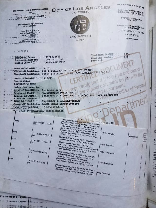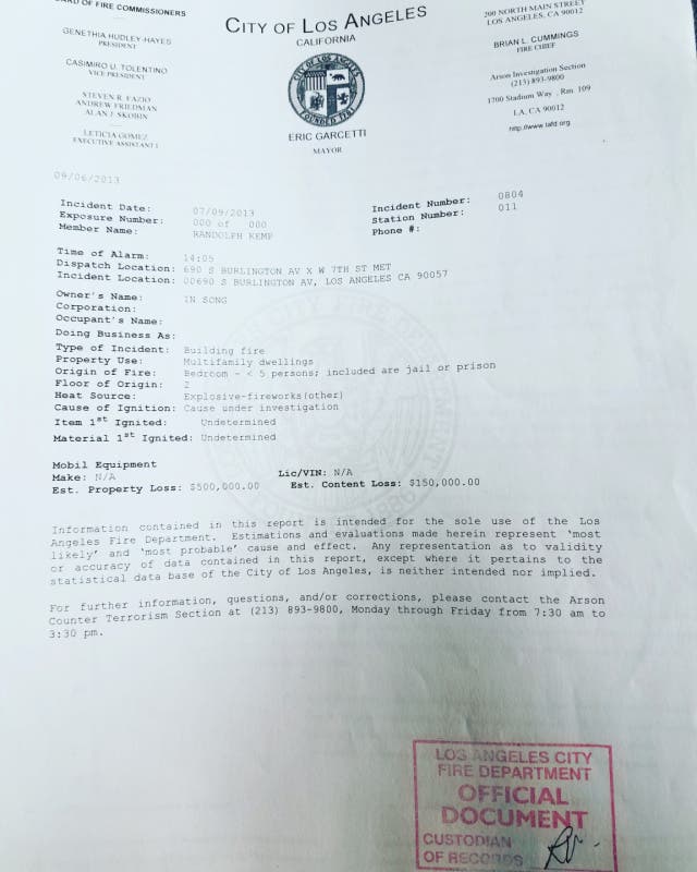 JULY 9TH, 2013. This is a Municpal Govt. Certified Document. Los Angeles FIRE DEPARTMENT {Arson-Counter Terrorism Section} LAFD incident #0804 [7/9/2013], dated September 2013. It states that the fire at my home was reported at around 2:05 p.m. on Tuesday, July 9th, 2013, just 6 hours after In Ok Song was served a summons and complaint to relinquish the illegal portions of my home that her family was illegally using for unlawful and unregulated rental market practices in the City of Los Angeles.