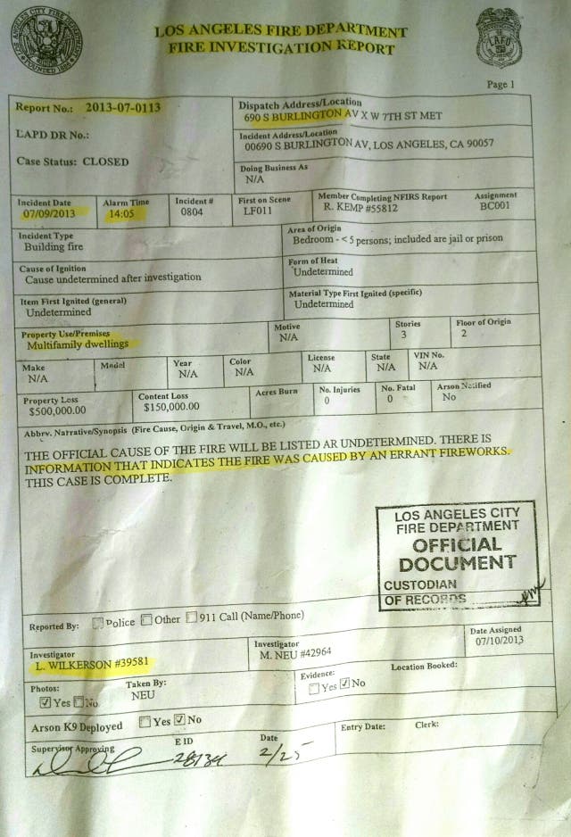 Incident LAFD #0804-Arson Investigation Report #2013-07-0113