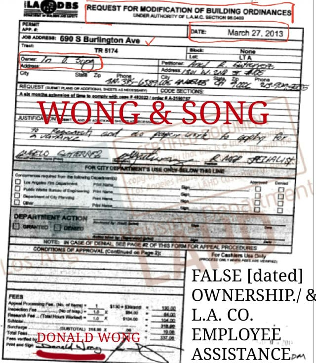 MARCH 23rd, 2013. This is a Los Angeles Co. Govt. Certified document. AN LOS ANGELES DEPT. OF BUILDING AND SAFETY [LADBS], CODE ENFORCEMENT UNIT, [CEU] application for a vacation /easement of municipal code regulations [p1/2]- pertaining to the conversion from a single family dwellilng to a 10 unit HOTEL. In Ok Song is ALREADY [3 years 4 months] presently operating an illegal multi family usage without municipal or county registration with the Dept of Environmental Health or the L.A. Housing Department. A Notice of Substandard Habitability related to LAMC 12.21 (misusage of premises) is already 51 days outstanding. A 45 day maximum to initiate permit application and commencement of works necessary to correct all noted LAMC violations had been exceeded. On this date 12 adult subtenants and a 1 (12 year old) child occupied numerous unregistered & unauthorized units at my residential premises. I was not lawfully informed by LADBS inspector Wong that a Notice of Substandard Habitability had been issued and was awaiting confirmation. LADBS Insp. Wongs’ inspection was limited. He was denied entrance and or could not inspect any of the hold over ‘units’ because of padlocking and non managerial supervision or entrance [key] availability to ‘units’ #1-9 and ‘unit’ #11. Inspector Wong did inspect my residential apartment unit on the attic [2nd & 1/2 story], the stairwells, hallway, kitchen, and porch. Although I initiated case 483023 [see request 180441], I was not properly informed and updated that a Failure to Comply was issued against the name Jun Sik Shin on January 31st, 2013 for the unlawful usage of a Single Family Dwelling or SFD as a multi unit ‘building’. However, on this easement In Ok Song files as OWNER, although she had relinquished ownership 12/10/2010. The assumption is that sister of the owner or Power of Attorney is ‘good enough’ to submit and signature as owner for the Easement application, (which also includes a description of [then] PRESENT USAGE to be operating as a legal SFD). Lies, and more lies. “2. PROJECT DESCRIPTION Describe what is to be done: to permit the chaNGE OIF USE FROM A SINGLE FAMILY DWELLING to an apartment hotel within 500 feet of distance from a Residential zone, and a reduction of 0 parking spaces in lieu of 10 code required spaces.” In Ok Song /Miguel Hernandez
