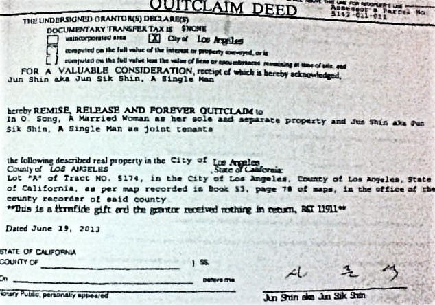 DECEMBER 10TH, 2010. This is a Los Angles Co. Recorders & Govt. seal Certified document. In SONG relinquishes her joint [50%] conveyance ownership to the individual, Mr. Jun Sik SHIN, a brother living in Seoul, S.Korea. She issues no change of ownership notice although continues to collect rents for 11 unauthorized unregistered units without LA Municipal compliance throughout the following 30 months, without any government regulation, supervision or redress with exception for inquiries initiated by myself. Similarly, In SONG never attempts to reconcile the illegality of her additional subtenancies upon my residential premises at the 690 S,. Burlington ST. address.