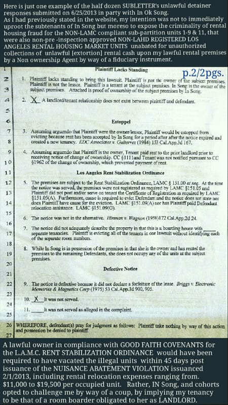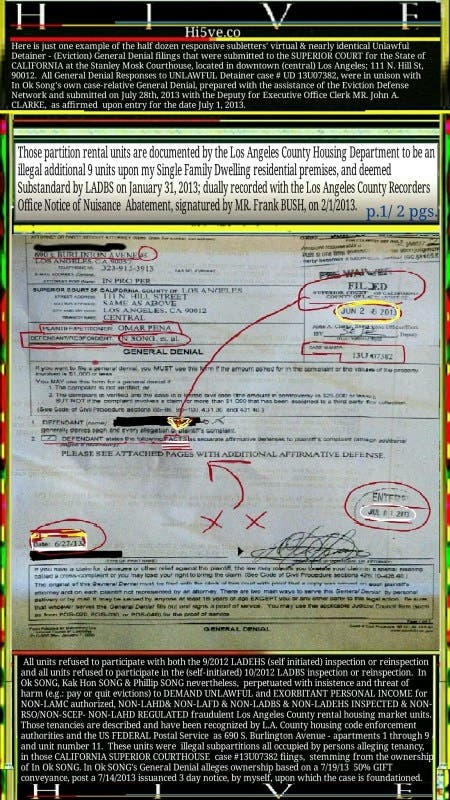 JUNE 19TH, 2013. This is a Los Angeles County Recorded and Govt. seal certified document. After issuing a June 14th, 2013 3-Day EVICTION NOTICE to In Ok SONG for operating { In Ok ‘Judy’ Song, Kak Hon ‘ Bruce’ Song, Phillip Song, Katherine ‘Sunnie’ Ahn} an illegal and unauthorized rental housing income business operation in violation of the premises certificate of occupancy, despite my rental agreement with Jun Sik Shin {solely}, and without the owners written and or documented consent. Fve days later In Ok Song filed with LA Superior Court as owner of a HOTEL boarding house, based on a June 19th, 2013 "gift conveyance". It is illegal to self gift to ones self as a power of attorney.