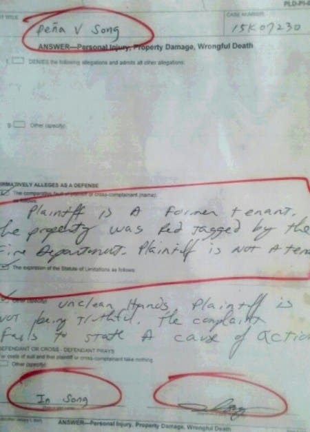 despite dangerous over capacity crowding and known fire hazard non LAMC code compliant sprinklers, halls, exits and alarms for my home as either a multi family building or a "room and board hotel" structure. Ultimately In Ok Song felt this substantiates an ACT OF GOD FIRE.
