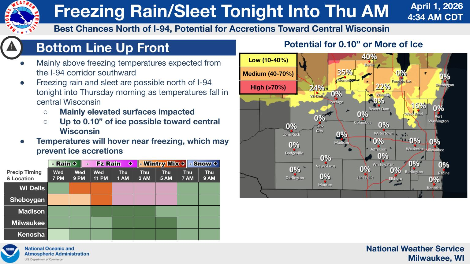 Forecasters say freezing rain and sleet are possible late Wednesday night into early Thursday, mainly north of the I-94 corridor. Ice accumulation is expected to be light overall, but a glaze of up to a tenth of an inch is possible, with isolated higher amounts.