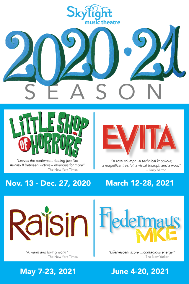 Skylight’s revised 2020-2021 subscription season opens with a holiday production of Little Shop of Horrors (Nov. 13 – Dec. 27). In 2021, Skylight will present the staged concert version of Evita (March 12-28, 2021). In April, Skylight presents Raisin, a musical based on the play A Raisin in the Sun by Lorraine Hansberry (April 30 – May 16, 2021). Closing the season will be Fledermaus MKE the modern-day Milwaukee adaptation of Johann Strauss’ operetta Die Fledermaus (May 28 – June 13, 2021).
