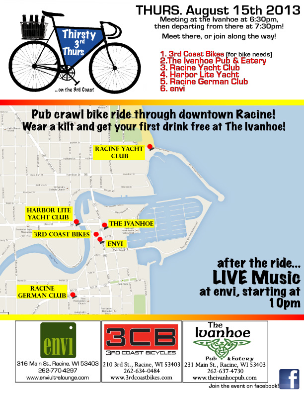 Join The Ivanhoe, envi, and 3rd Coast Bikes for a night of bike ride pub crawling...to all of our local "Clubs!"