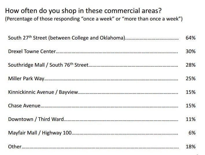 According to survey data, 64 percent of respondents shop on 27th Street at least once a week. The next most-popular destination is Drexel Town Square in Oak Creek follwed by Southridge Mall or on S. 76th Street in Greendale/Greenfield.