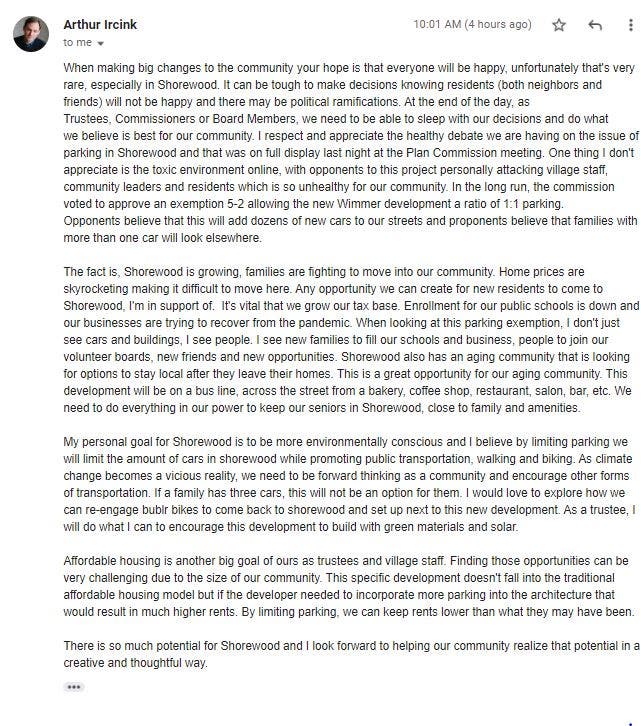 "I respect and appreciate the healthy debate we are having on the issue of parking in Shorewood and that was on full display last night at the Plan Commission meeting," Village Trustee Arthur Ircink said in a statement to Patch. "One thing I don't appreciate is the toxic environment online, with opponents to this project personally attacking village staff, community leaders and residents which is so unhealthy for our community.