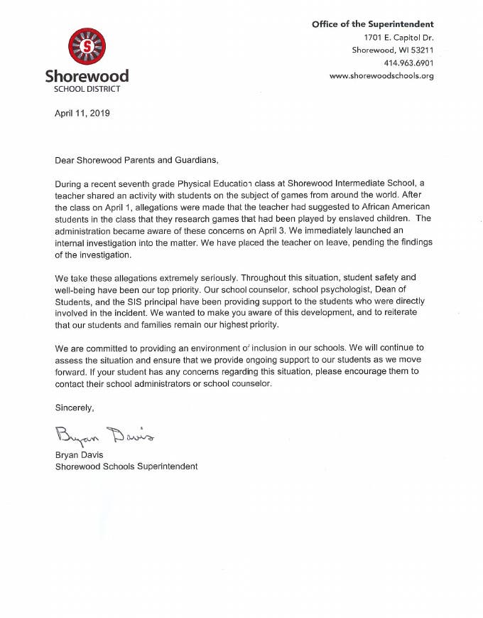 The letter continues, saying that following the class, students reported that the teacher told black students in the class that they research games once played by children who had been enslaved, referencing an earlier time in U.S. history.