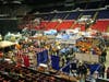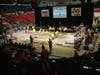 At this event there are two levels of challenges. The robots competed three against three. The first challenge involved picking up inflatable triangle, circle and square tubes, and placing them on the rack in order of the FIRST logo. The team earned points for the number of logos they were able to make in the time given.