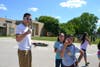 Two girls, standing side by side watching the activities, answer quickly when asked.