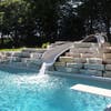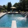 Swimming Pool Services transformed the backyard into a vibrant space with plenty of natural textures and inviting features. A large inground pool and a hot tub beckon with shimmering waters. Natural Lannon grey outcropping stones form a raised wall that pushes surface water along the rear property line, away from the patio and home. A pool slide was built into the stone wall for continuous enjoyment.
