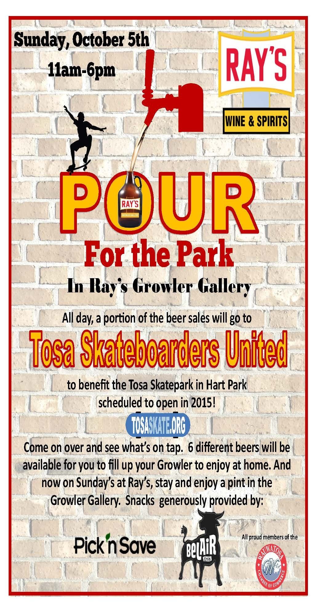 All day on Sunday, Ray’s will be donating a portion of the proceeds of all beer sales in the Growler Gallery to the Tosa Skateboarders. So come and fill up your Growler with some of the freshest, finest beer direct from the tap to your home while helping to support this state-of-the-art park.