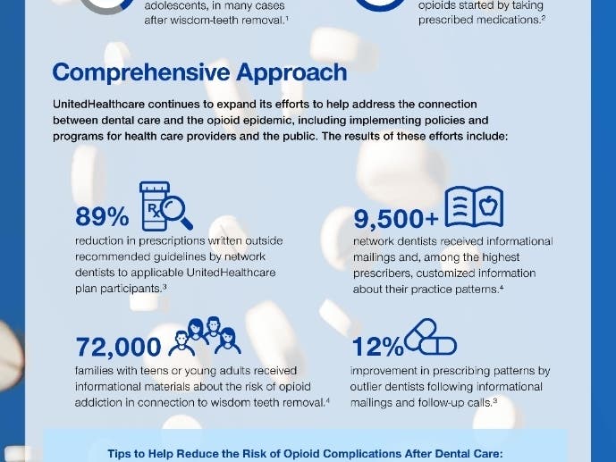 Access Information: Oral health professionals write 12% of all opioid prescriptions, including 54% of opioid prescriptions for adolescents, according to a UnitedHealthcare analysis of claims data.[2] While any dental procedure should involve professional advice from a dentist or oral surgeon, patients and parents should be aware of the risks associated with potential exposure to opioids following care. To that end, parents, educators and health professionals should consider publicly available resources, such as this public service announcement and this toolkit, which includes commonly asked questions and a pain-management checklist to help patients better understand options before and after wisdom-tooth extraction.
